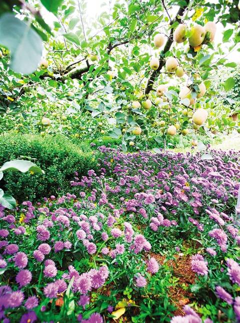 사과나무와 포도나무 밑에서 자라는 국화는 맺힌 사과와 포도와 어울려 더욱 운치를 더한다. 일명 '과수원 속 국화'며, 국화향에 취한 사과라고 부른다. 국화 향기를 맡으며 자란 사과는 더욱 알차고 맛있을 것 같다.