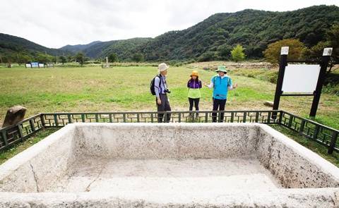 ↑ [월간산]서산 허수정 문화관광해설사가 보물인 보원사지 석조에 대해 설명하고 있다. |