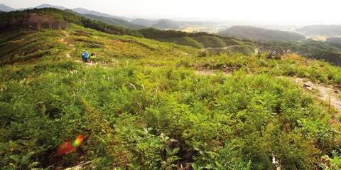 ↑ [월간산]아라메길을 상징적으로 보여 주는 장면이다. 상아산 정상에서 왼쪽으로는 가야산, 오른쪽으로는 서해 바다를 보며 산과 바다를 보며 걸을 수 있는 길이 서산 아라메길이다. |