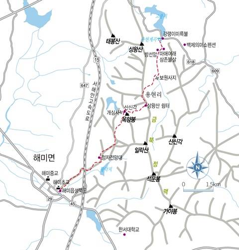보원사지를 지나면서부터는 산길로 접어든다. 상왕산(象王山·353m)이다. < 여지도서 > 에는 상왕산에 대해 '관아의 서북쪽 10리에 있으며, 가야산에서 뻗어온다'고 수록돼 있다. < 세종지리지 > 에는 상왕산에 대해 '현의 사람들이 진산(鎭山)으로 삼는다'고 기록하고 있다. 산 모양이 상아 뿔과 같아서 상왕산이란 이름이 붙여졌다고 전한다. 불교 색채가 물씬 풍기는 이름이다.