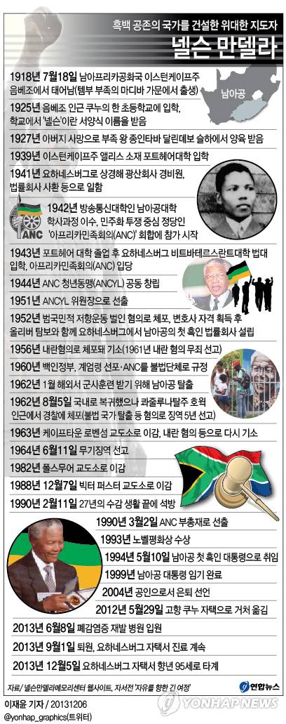 남아공의 첫 흑인 대통령으로 노벨평화상 수상자인 만델라는 용서와 화합의 정신을 실현한 정치인으로서 세계인의 존경을 받아왔다. 그가 공개석상에 모습을 드러낸 것은 지난 2010년 남아공 월드컵대회가 마지막이었다.