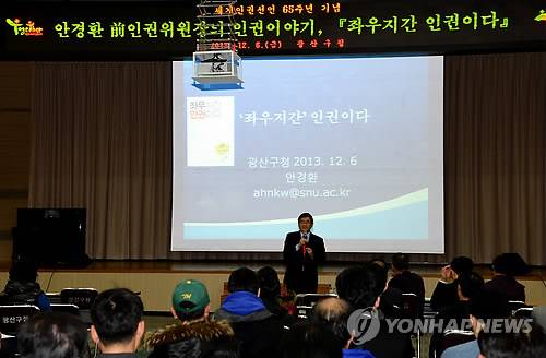 이날 '좌우지간 인권이다'를 주제로 강연에 나선 안 전 위원장은 인권을 좌-우 개념이 아닌 보편적 균형의 관점에서 봐야 한다고 강조했다.