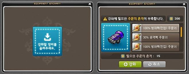 장비 강화 방식도 개선해 이용자들이 부담없이 더 좋은 장비를 마련할 수 있도록 변경할 예정이다. 우선 강화 관련 유저 인터페이스를 개선해 보다 편하게 강화가 가능해지고 주문서 종류를 줄여 하나의 주문서로도 다양한 주문서 강화 효과를 줄 수 있도록 개편한다. 또 아이템 강화시 아이템 파괴 확률 가능성도 낮춘다.