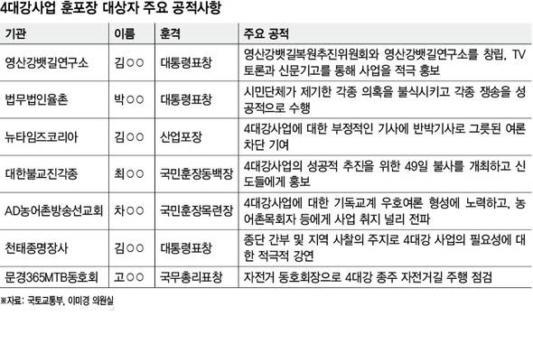 8일 <한겨레>가 이미경 의원실(민주당)을 통해 입수한 '4대강 훈포장 주요 공적사항' 자료를 보면, '4대강 사업 홍보', '4대강 사업 홍보기사 작성', '4대강 반대집회 무마' 등 황당한 공적사항이 서훈 사유로 명시돼 있었다.