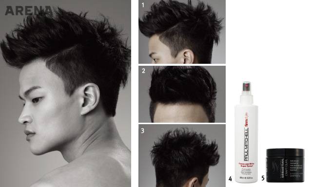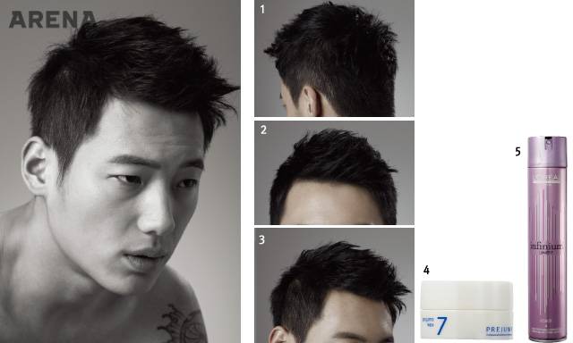 Cut Point 1. 더블 커트로 연출한 뒷머리가 이 헤어스타일의 반전 포인트라 할 수 있다. 뒤통수를 볼륨감 있게 표현해줘 두상이 입체적으로 보인다. 2. 드라이할 때 윗머리는 주먹으로 쥐듯이 구겨가며 말려 볼륨감을 살려준다. 왁스를 바를 때도 마찬가지. 앞머리는 살짝 옆으로 눕히듯이 세워준다. 훨씬 단정한 느낌이다.3. 짧게 민 옆머리와 길게 유지한 윗머리가 자연스럽게 연결되도록 한다. 짧은 머리가 윗머리까지 침범하면 모히칸 헤어가 될 수도 있으니 주의하도록.