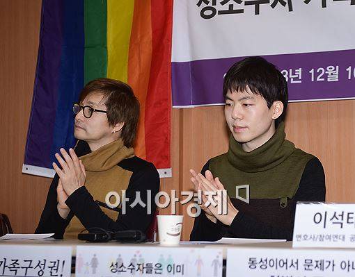 [아시아경제 정준영 기자] 김조광수 감독, 김승환 레인보우팩토리 대표가 10일 오전 서울 종로구 통인동 참여연대 느티나무홀에서 열린 '성소수자 가족구성권 보장 및 혼인신고 수리 촉구를 위한 기자회견'에 참석해 박수를 치고 있다.