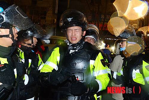 【서울=뉴시스】고승민 기자 = 22일 오후 서울 중구 정동 민주노총 앞에서 일부 경찰 대원들이 서로 쏜 캡사이신을 맞고 자리를 피하고 있다. 2013.12.22.