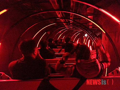 【문경=뉴시스】김진호 기자 = 24일 경북 문경시 가은읍 석탄박물관 안에서 관광객들이 모노레일을 타고 갱도체험을 하고 있다. 문경시는 총사업비 132억원을 투입해 석탄박물관 야외부지 6605㎡에 고생대, 중생대, 석탄기, 광업의 발달, 미래세계 등을 표현한 갱도체험시설을 준공했다. 2013.12.24 (사진= 문경시 제공)