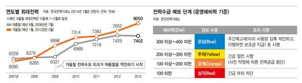 이는 불과 몇 년 전까지만 해도 전력수급 상황이 그리 위태롭지 않았다는 사실을 보여준다. 최근 몇 년 새 전력수요가 피크를 기록할 즈음마다 떠들썩한 비상대책을 마련하게 된 배경엔 2000년대 중반 이후 두드러진 '전기화'(유류 등 다른 에너지를 전기로 대체하는 것) 현상이 있다. 한 예로, 과거에는 해마다 한여름에만 최대 전력수요에 대비한 대책을 세웠지만, 요즘은 한겨울에도 전력수요 피크에 대비해야 한다. 정부가 전기요금을 묶어두면서 전기난방이 급증한 데 따른 결과다. 2009년 이후로는 겨울철 최대 전력이 여름철을 넘어서는 역전 현상마저 빚어지고 있다. 2009년 8월 여름 피크가 6321만㎾였는데, 그해 겨울 피크에 해당하는 2010년 1월에는 6896만㎾를 기록했다.