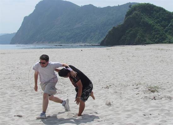 한바탕 춤판이 끝나자 게임을 한단다. 이번에는 춤추는 모습을 지켜보고만 있던 일부 유럽 관광객들까지 합세한다. 게임의 방식은 간단하다. 관갱객과 북한동포를 끈으로 느슨하게 엮고 멀리 세워놓은 목표물을 돌아 출발점에 먼저 도착하면 된다. 맨 먼저 도착하는 이들에게는 상품을 준다. 예전 학교 운동회 때 많이 해봤던 게임이다.