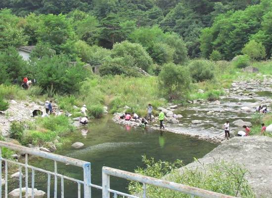 칠보산으로 향하는 북한 관광객을 태운 버스 몇 대가 개울 옆에 서 있다. 버스에서 내린 사람들은 개울물에 발을 담그고 휴식을 취하고 있다. 우리도 그곳에서 10분쯤 쉰다고 한다.