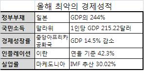 [이데일리 김유성 기자] 올해 최악의 경제 성적을 보인 국가는 일본을 비롯해 말라위, 이란, 중앙아프리카공화국, 마케도니아 등이다. 이에 비해 브루나이, 룩셈부르크, 남수단, 적도기니, 미국 등은 올해 최고 경제 성적을 거둔 나라로 뽑혔다.