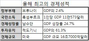 올해 최고의 경제 성적을 거둔 국가로는 브루나이, 룩셈부르크, 남수단, 적도기니, 미국이다.