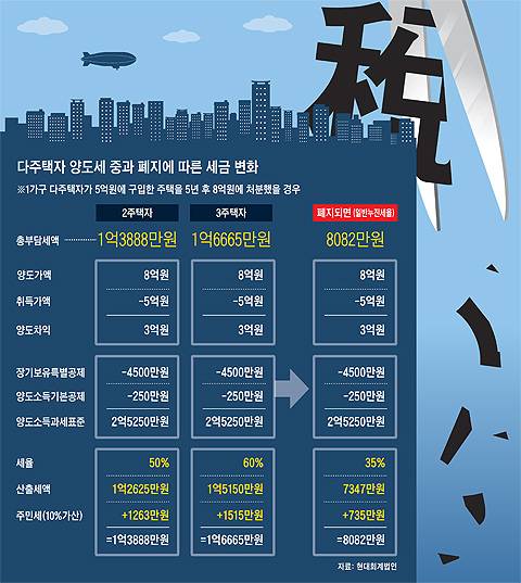 세금도 일반적인 수준으로 환원된다. 5억원짜리 집을 산 사람이 5년 후 이 집을 8억원에 팔았다면 현행 중과 제도하에서는 2주택자는 1억3900만원, 3주택자는 1억6700만원의 세금을 내야 했다. 하지만 이 제도가 폐지되면 8000만원만 내면 된다.