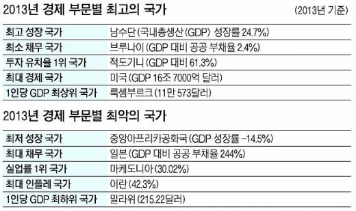 반면 중앙아프리카공화국은 올해 마이너스 14.5%라는 최악의 경제 성장률을 기록했다. 금과 다이아몬드, 우라늄 등 천연자원이 풍부하지만 쿠데타 등 지속적인 정정 불안에 시달려 경제가 위태로운 상황이다. 아프리카 대륙의 또 다른 나라인 말라위는 세계에서 가장 가난한 나라로 꼽혔다. 올해 말라위의 1인당 국민소득은 215.22달러(약 22만원)로 국민의 절반 이상이 하루 1달러 미만으로 생활하고 있다. 세계 경제 3위 국가인 일본은 GDP 대비 공공 부채율이 244%에 달해 최대 채무 국가라는 불명예를 안았다. 이는 재정 위기에 시달리고 있는 그리스의 부채율 175%를 훨씬 뛰어넘는 것이다. 일본은 재정 건전성을 강화하기 위해 내년 4월 소비세율을 현행 5%에서 8%로 올리기로 했다.
