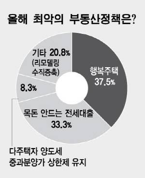 반면 '최악의 정책'으로는 박근혜정부의 대표적 주거복지정책인 '행복주택'(37.5%)이 꼽혔다. 소통없는 밀어부치기식 정책 추진으로 주민들과의 갈등을 조장하고 결국 시작도 하기 전에 대폭 수정된 점을 문제로 지목했다. 시장 상황과 맞지 않아 철저하게 외면받은 '목돈 안드는 전세대출'이 근소한 차이로 뒤를 이었다.