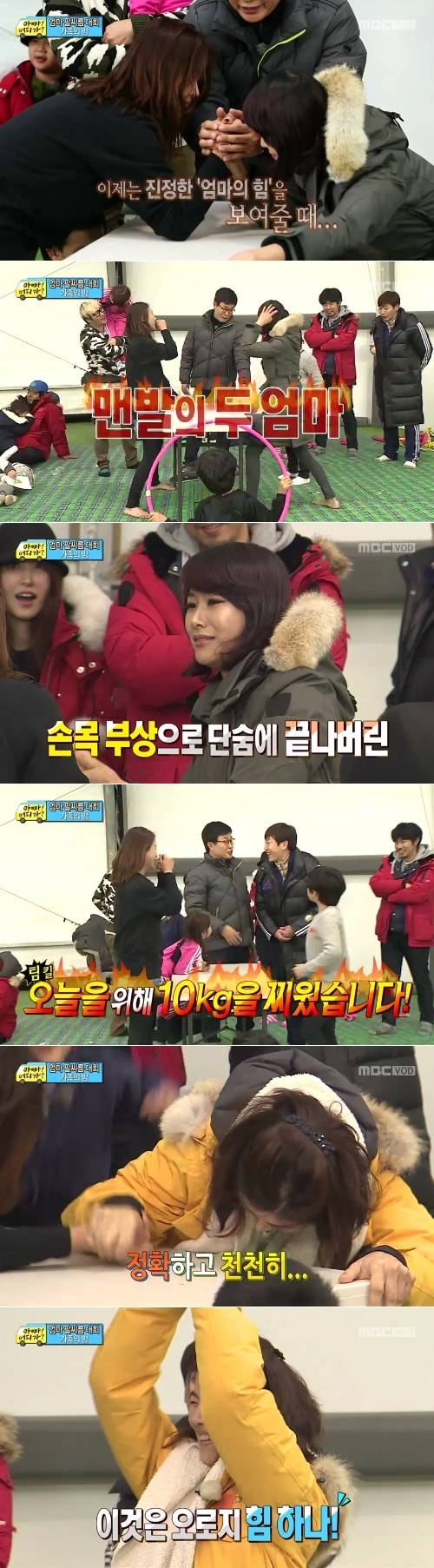 이날 다섯 엄마들의 팔씨름 대회가 펼쳐졌다. 가위바위보에서 이긴 성동일 아내 박경혜는 자연스럽게 결승에 진출했고 이종혁 아내vs윤민수 아내, 김성주 아내vs송종국 아내의 대결이 펼쳐졌다.