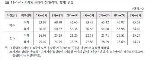아울러 1~8차 패널 조사에 참여한 전체 9천407가구 중에서는 35.35%가 8년(2005~2012년)동안 적어도 1년이상 빈곤(저소득층)을 경험한 것으로 조사됐다.