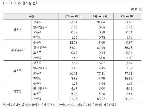 고용 형태도 '고착' 경향을 보였다. 2011년 임시·일용직이었던 근로자 가운데 1년사이 상용직으로 전환된 경우는 9.97% 뿐이었다. 2009~2010년(12.78%), 2010~2011년(15.05%)에 비해 뚜렷하게 낮아졌다.