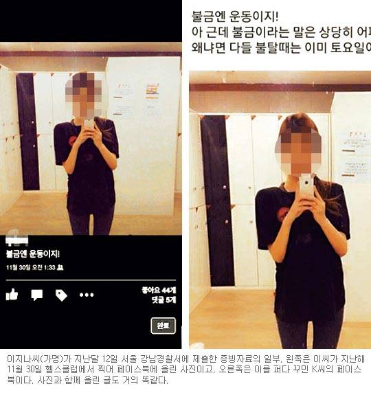 K양은 치밀하고 집요했다. 이씨가 지난해 11월 30일 '불금(불타는 금요일)엔 운동이지!'라는 글과 함께 헬스장에서 운동복 입고 찍은 사진을 올리자 K양은 이 사진을 퍼다 자신의 페이스북에 추가하며 똑같은 문구를 적었다. 곧 많은 남성이 '섹시하다' '몸매가 좋다'는 댓글을 달았고 K양은 마치 자신이 칭찬받은 양 답글을 올렸다.
