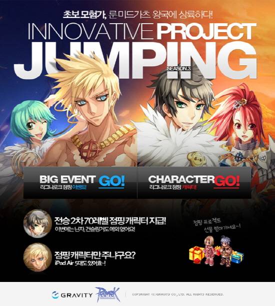 더불어 점핑 캐릭터를 받은 유저들이 특정 레벨에 달성할 때마다 조건에 따라 '무료 캐시''황금 인장카드''아이패드 에어 와이파이 32GB' 등을 추첨을 통해 지급하며, 매주 3시간 이상 '라그나로크'를 플레이한 모든 유저들에게는 8주에 걸쳐 매주 게임 아이템 및 경품이 제공된다.