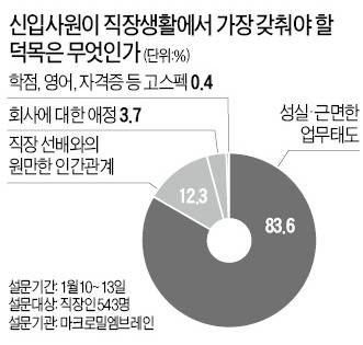 응답자의 43.8%는 신입사원의 가장 아쉬운 점으로 '지나치게 자유분방하고 개인적인 사고방식'을 꼽았다. 이어 △불성실한 업무태도(28.2%) △조직생활 부적응(14.9%) △회사에 대한 애정이 없는 점(12.3%) 등의 순이었다. 직장인의 83.6%는 신입사원이 갖춰야 할 최고 덕목으로 '성실·근면한 업무태도'를 꼽았다. 학점, 영어, 자격증 등 스펙을 꼽은 비율은 0.4%에 불과했다.