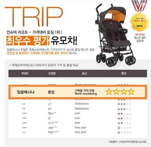 특히 트립은 소비자시민모임이 국제소비자테스트기구(ICRT)와 함께 실시한 컨슈머리포트 유모차 11종 비교정보 제공 결과에서 최고 등급인 '구매할 가치 있음(Worth considering)' 평가를 받은 제품으로 가격대비 품질평가 1위를 차지해 소비자들에게 큰 인기를 얻고 있다.