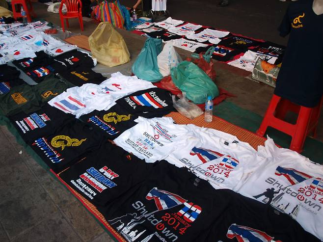 물품마다 '2014 셧다운' '리스타트(restart·다시 시작하다) 방콕' 같은 구호가 장식돼 있었다. '왕이시여 영원하라(Long live the King)' 같은 문구가 쓰인 물품도 많았다. 태국에서는 국왕이 '살아있는 신'처럼 여겨진다. 반정부 지도자들도 현 정권 퇴진을 요구하면서 국왕의 뜻을 명분으로 내세우기도 한다.