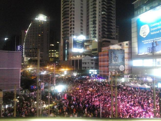 시위대는 바리케이트로 아속(asoke) 교차로를 막고 대형 전광판까지 설치해 둔 상태였다. 무대 위에서 유명 가수가 노래를 불렀다. 연이어 시위 지도자들이 정부 타도를 외치는 연설을 쏟아냈다. 시위 참가자들은 태국 국기가 그려진 모자를 쓰고 팔찌를 찬 채 연설에 귀기울였다. 연설 중간중간 호루라기를 불고 박수도 치며 분위기를 돋웠다.