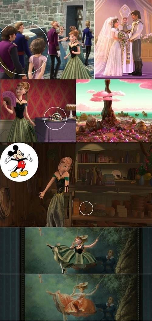 언니 엘사의 대관식이 열리는 날, 동생 안나가 성문 밖을 나서는 장면에서 '라푼젤'의 라푼젤과 유진이 성에 놀러온 것을 확인할 수 있다. 안나가 'For The First Time In Forever'를 부르며 성 이곳 저곳을 돌아다닐때는 '주먹 왕 랄프'의 슈가 러쉬, 안나가 소파 위로 뛰어오를때 흉내낸 그림은 '라푼젤'에서도 등장한 그림이다.