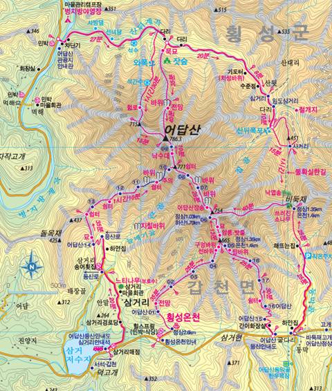 횡성온천을 등산기점으로 정상을 다녀오는 산행거리는 약 5.2km에 4시간 안팎 소요된다.