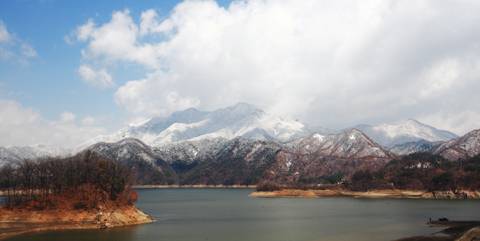 ↑ [월간산]횡성에서 갑천 방면 19번 국도가 지나는 중금리에서 횡성저수지 건너로 본 어답산. |