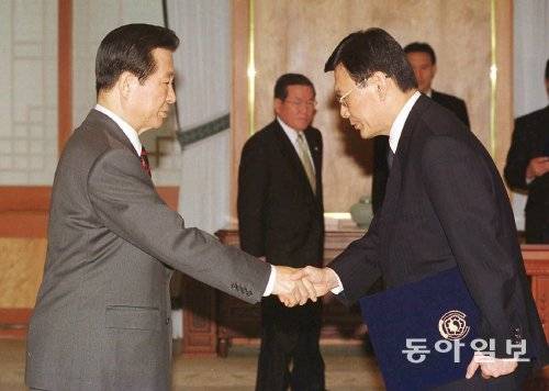 2000년 4월 국정원 2차장에 임명된 김은성(오른쪽). 김은성은 권력 요로에 줄을 대고 있었으나, 권노갑 고문은 그를 불신했다. 권 고문이 김태랑 전 의원을 국정원 기조실장으로 추천하려 한다는 소문에 김은성은 자기를 쫓아내려는 것인 줄 알고 이를 막으려 백방으로 뛰었다. 동아일보DB |