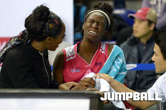 08일 용인 실내체육관에서 열린 2013-2014 우리은행 여자프로농구 용인 삼성생명과 부천 하나외환의 경기에서 하나외환 이파이가 슛을 하고 착지를 하다가 손목 부상을 입고 고통스러워하며 코트 밖으로 나가고있다. 저작권자 ⓒ 점프볼. 무단 전재-재배포 금지2014-02-08 신승규 기자( sks731001@hanmail.net)