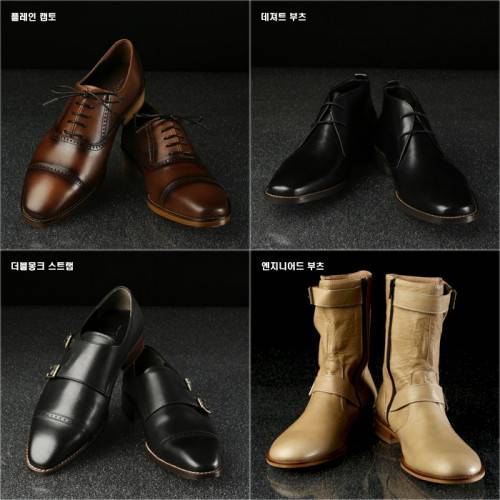 클래식한 분위기를 즐긴다면 베이직아이템인 플레인캡토슈즈를, 화려하지않으면서도 멋을 낼수 있는 더블몽크스트랩 슈즈, 고급스럽고 캐쥬얼할 룩엔 데저트부츠가 금상첨화.