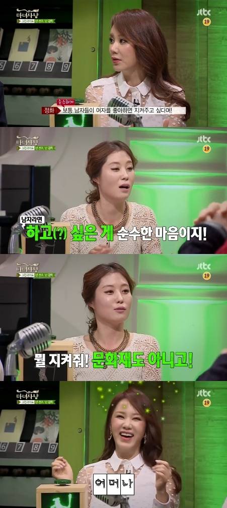 엄정화 발언에 문소리는 "좋아하는 여자를 만나면 하고 싶은 게 순수한 남자 마음이다. 뭘 지켜주나. 문화재도 아닌데"라고 말해 웃음을 자아냈다.