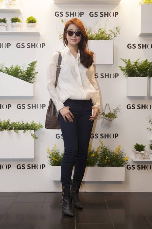 이태란이 GS SHOP 리빙 컬렉션 포토월 앞에서 포즈를 취하고 있다.