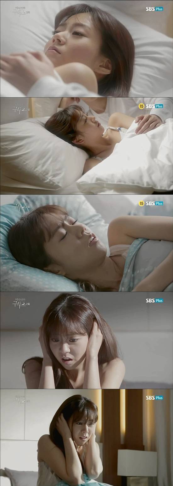 24일 방송된 SBS플러스 드라마 '여자만화 구두' 1·2화에서 한승연은 어깨와 상체 일부를 노출하고 침대 위에서 짝사랑 상대와 묘한 분위기를 연출하는 연기를 펼쳤다.