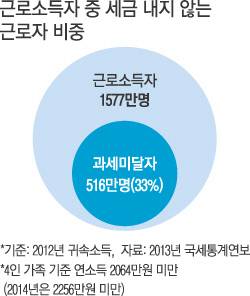 2일 국세청의 '2013년 국세통계연보'를 보면 2012년 귀속소득 기준으로 근로소득자 1577만명 중 세금을 내지 않는 과세미달자는 516만명이다. 전체 근로자의 33%다. 과세미달자는 세금을 내지 않기 때문에 정부가 월세를 세액공제해주더라도 돌려받을 세금이 없다. 이들의 2012년 연소득(4인가족 기준)은 2064만원 미만이었다.