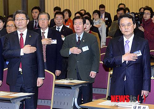 【서울=뉴시스】최동준 기자 = 6일 오후 서울 중구 명동 은행회관에서 열린 민화협 제16차 정기 대의원회에서 홍사덕(오른쪽) 민화협 상임의장과 류길재(왼쪽) 통일부 장관을 비롯한 참석자들이 국민의례를 하고 있다. 2014.03.06.