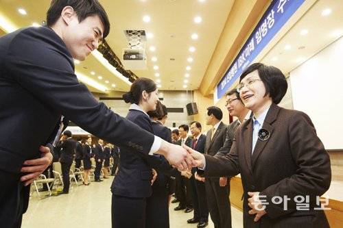 한편 기업은행은 학력에 대한 사회적 편견을 없애고 다양한 인재 확보를 위해 금융권 최초로 2011년부터 특성화고 출신을 채용하고 있다. 2011년 67명, 2012년 109명, 지난해에는 110명을 채용했다. 특성화고 학생들의 조기 조직 정착과 적응을 위해 '업무 멘토' '인생 멘토'를 지정해 체계적이고 제도적인 지원을 하고 있다.