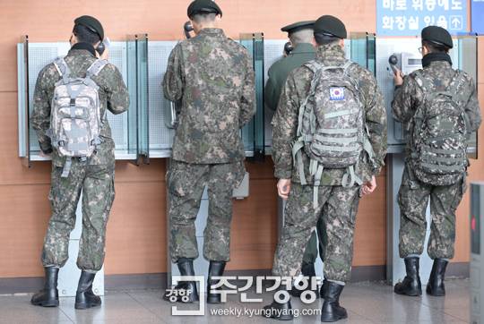 디지털무늬 배낭을 메고 휴가를 나온 병사들이 서울역 국군철도수송지원반 앞에서 공중전화를 이용하고 있다. | 이상훈 기자 |