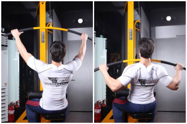 동작1:와이드 그립바를 넓게 잡아 광배근을 최대한 넓힌 자세로 고정한다.