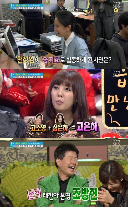 이날 방송에서는 스타의 이름을 따서 예명을 지어 성공한 스타로 송지효, 고은아, 태진아 등의 사연이 공개됐다.