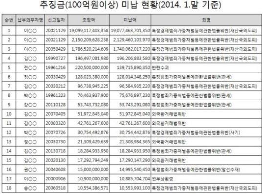 이 밖에 기업인 김모씨는 재산 국외도피 혐의로, 회사 이사 박모씨는 관세 탈세 혐의로 각각 선고받은 추징금 966억원, 757억원을 안 내고 있다.
