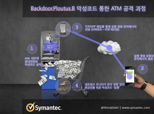 시만텍은 2013년 하반기 멕시코에서 외부 키보드를 통해 현금자동입출력기(ATM)에 저장된 현금을 인출하는 악성코드 `Backdoor.Ploutus'를 발견했다. 또 모듈식 아키텍처로 변형된 악성코드 `Backdoor.Ploutus.B'도 추가로 발견했다. 이 악성코드는 영어로도 번역돼 공격자가 다른 나라에도 이를 유포할 의도가 있었다는 게 회사측의 분석이다.