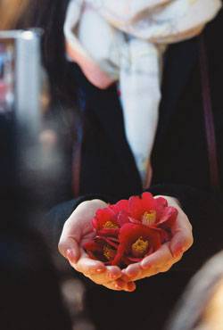 ↑ 지심도에서 '여심화(女心花)' 동백꽃을 한 움큼 손에 쥔 여인. |