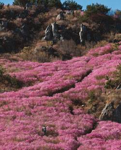 동백꽃이 시들해진 4월에도 거제도는 꽃구경하기 좋다. 바닷가의 양지바른 비탈에 산벚꽃과 개복숭아꽃이 흐드러지게 필 즈음이면 대금산 자락에 진달래도 만개한다. 대금산은 거제시 장목면 대금리와 외포리 사이에 자리한 산이다. 진달래 명산 중 하나로, 산세가 부드럽고 완만하다. 먼발치서 보면 마치 자상한 어머니가 아기를 품은 듯한 형상이다. 정상 높이는 해발 437m에 불과하지만, 바닷가에 자리 잡아 시야가 활달하다. 거가대교와 진해만 바다 저편에 부산, 마산, 진해 등 시가지는 물론 항구까지도 또렷하게 보인다. 날씨가 쾌청한 날에는 일본 쓰시마 섬까지도 아스라하다. 진달래 군락은 대금산 정상 부근 산등성이와 산비탈에 형성돼 있다. 날씨와 기온에 따라 해마다 달라지지만, 대체로 4월 10일 전후 절정에 이른 진달래꽃을 감상할 수 있다.