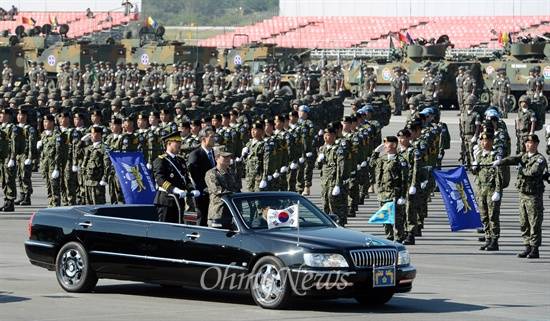 | ▲ 2013년 9월 27일 오전 경기도 성남 서울공항에서 열린 건군 제65주년 국군의 날 기념행사 최종 리허설에서 김관진 국방부 장관이 사열하고 있다. |