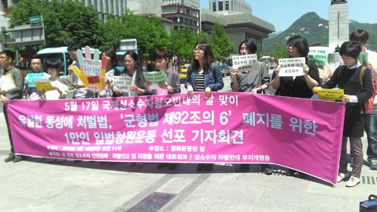 | ▲ 군형법 제92조의 6 폐지를 위한 1만인 입법청원운동 선포 기자회견 사진으로 약 2개월간의 청원운동을 통해 2013년 6월 26일 5690명의 청원서를 국회에 제출한 바 있다. |